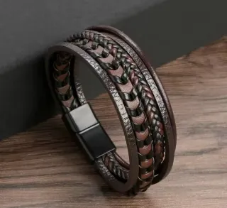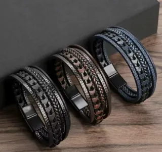 Pulsera de cuero con un diseño multicapa y cierre magnético. Disponible también en marrón. - Material: Cuero - Diseño trenzado - Cierre magnético Mas pulseras en mi perfil SI TE QUEDAS 3 MODELOS DE CUERO POR 20 EUROS LAS 3.