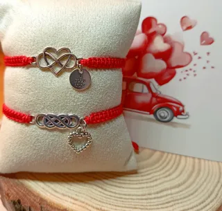 Pulseras rojas con detalles plateados. - Pulsera superior con símbolo de infinito y corazón, y charm I Love You. - Pulsera inferior con símbolo de infinito y charm de corazón. - Precio por unidad.