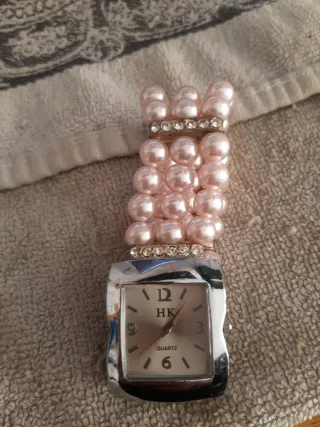 Elegante reloj con pulsera de perlas y detalles de cristales. - Pulsera elástica con varias hileras de perlas. - Adornos de cristales brillantes en la unión con la esfera. - Esfera cuadrada con detalles dorados.