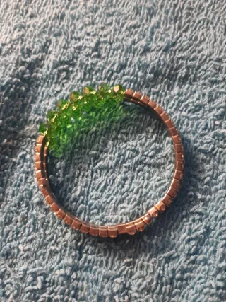 Elegante pulsera con un diseño delicado y adornos en tonos verdes. - Base de pulsera en color plateado. - Detalle de cuentas verdes brillantes.