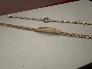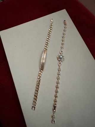 Elegantes pulseras bañadas en oro. precio X los dos - Pulsera con eslabones cubanos y detalle central con diseño griego. - Pulsera fina con corazones y una piedra central. - Cierre de mosquetón.