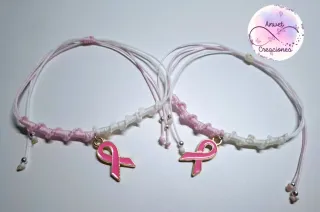 Pulsera artesanal con un lazo rosa, símbolo de la lucha contra el cáncer. - Diseño único y hecho a mano. - Cordón resistente y ajustable. - Detalle metálico dorado. 1€ irá destinado a la Asociación Española Contra el Cáncer de mama.