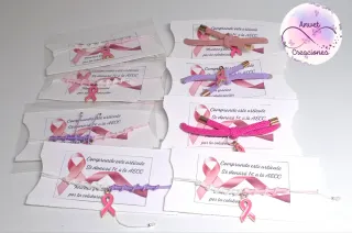 Pulsera artesanal de macramé, elaborada por Anvet Creaciones, con un diseño especial para apoyar la lucha contra el cáncer. - Cada compra de este artículo dona 1€ a la AECC. - Incluye un charm con el lazo rosa. - Disponible en tonos rosa, morado combinados con blanco.