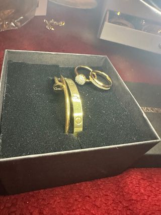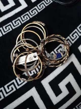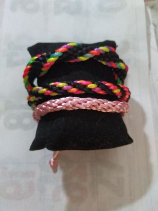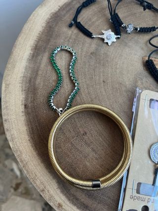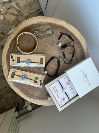 Conjunto de pulseras de la marca. - Pulsera con detalle de estrella. - Pulsera con cuentas negras y detalle brillante. - Pulsera con motivo circular. - Pulsera con motivo circular. - Pulsera con detalle de rosa en caja. - Pulsera con cuentas verdes. No se las marcas de muchas de las pulseras. Muchas de las pulseras son nuevas, ni se han usado