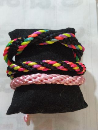 Conjunto de dos pulseras tejidas a mano. - Una pulsera con diseño multicolor. - Otra pulsera de color rosa.