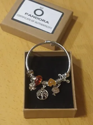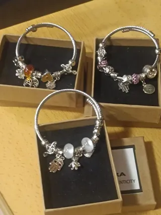 Conjunto de tres pulseras estilo Pandora, elaboradas en acero inoxidable. Cada pulsera presenta un diseño único con diversos abalorios. - Pulsera con abalorios de cristal blanco y dijes de mano de Fátima y osito. - Pulsera con abalorios rosas y dijes variados. - Pulsera con abalorio naranja, dijes de árbol de la vida y corazón. 10€ cada una las 3 por 25€