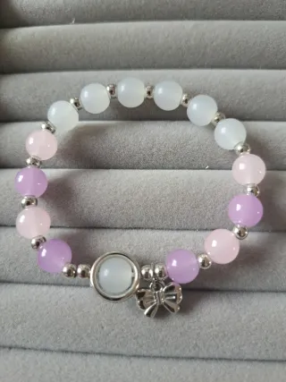 Conjunto de dos pulseras de cristal con abalorios y dijes de mariposa. Son un accesorio delicado y elegante. - Una pulsera tiene tonos azules y un dije de mariposa azul oscuro. - La otra pulsera tiene tonos rosados y un dije de mariposa rosa pálido. - Cuentan con cuentas de cristal transparentes y opacas. - Elementos metálicos dorados.