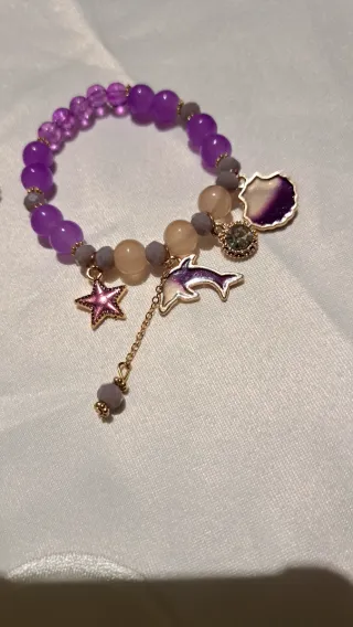 Bonita pulsera de cristal con detalles dorados y colgantes. - Elaborada con cuentas de cristal morado. - Incluye un colgante de estrella y otro de delfín. - Adornada con cuentas pequeñas grises y doradas.