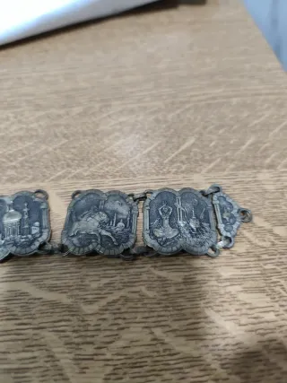 Elegante pulsera con varios dijes detallados, inspirada en diseños vintage. - Diseño con escenas y figuras. - Acabado metálico plateado.