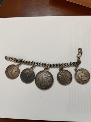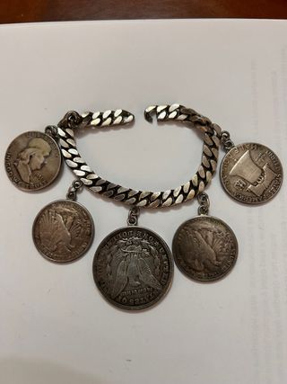 Pulsera vintage con varios dijes de monedas americanas de Plata. - Diseño de cadena robusta. - Dijes de monedas con detalles. - Cierre de mosquetón.
