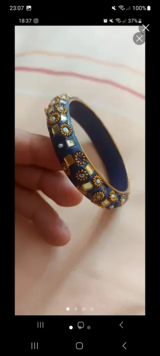 Elegante pulsera de cerámica con detalles en dorado y pedrería. - Diseño con motivos florales y cuadrados. - Acabado brillante.