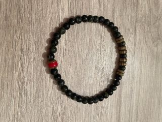 Pulsera elástica con cuentas de piedra negra y detalles metálicos. - Diseño con cuentas de piedra natural. - Adornos metálicos en tono dorado. - Un detalle central de cuenta roja.