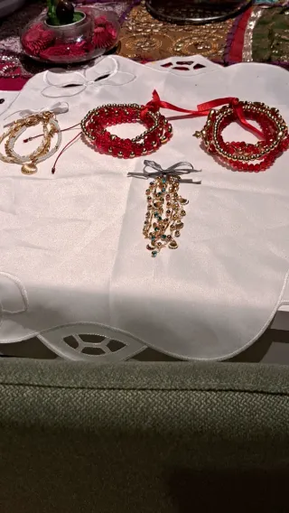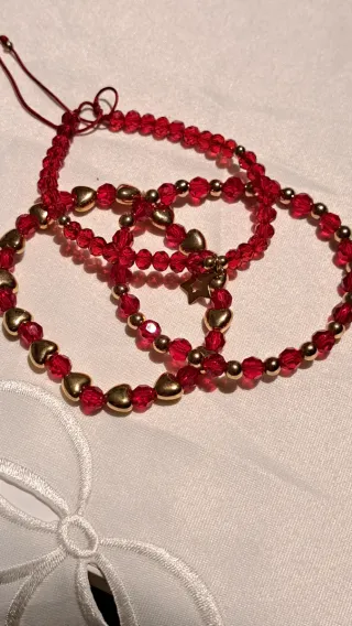 Conjunto de pulseras hechas a mano con cuentas rojas y detalles dorados. - Diseño con cuentas de cristal facetado. - Adornos en forma de corazón. - Cuentas doradas pequeñas. - Cierre ajustable.