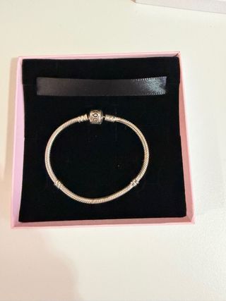 Pulsera de plata de ley de la marca Pandora. Cadena de serpiente en tres secciones separadas y cierre de barril con letras en relieve. Mide 17cm