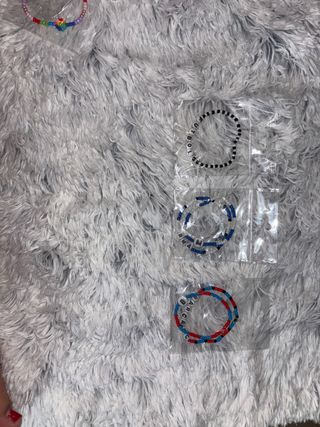 Conjunto de pulseras hechas con bolitas. - Pulsera con bolitas de colores variados. - Pulsera con bolitas blancas. las dos pulseritas a 2,5€ la unidad 1€