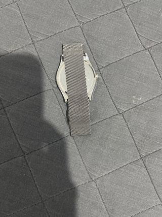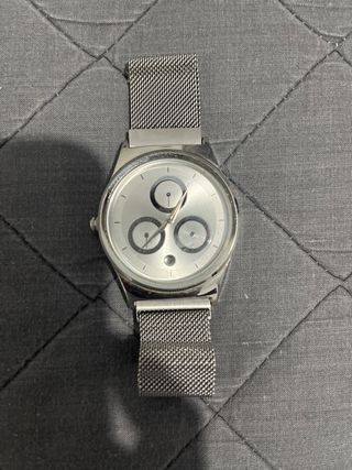Elegante reloj de pulsera con un diseño moderno y minimalista. - Correa de malla plateada. - Esfera blanca con detalles en negro. - Cierre de seguridad.