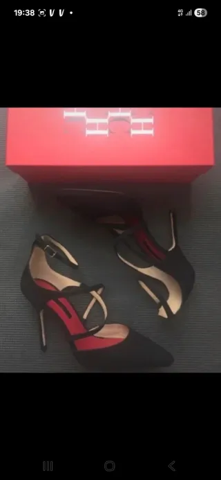 Elegantes zapatillas de tacón con un diseño cruzado. - Color negro con detalles interiores en rojo. - Cierre de pulsera al tobillo.