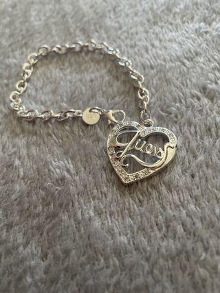 Pulsera en plata 925 tipo TS, con eslabones ovalados, destacan los colgantes en plata 925 de la suerte y de elementos del amor, el toque final como cierre y elemento decorativo, es el aro en plata 925 con inscripción TS, cierre de tipo pinza de langosta. Medida: 21 cm