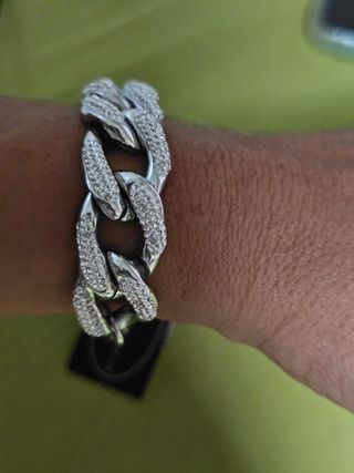 Elegante pulsera con diseño de eslabones cubanos, adornada con pequeñas pedrerías brillantes. - Diseño de eslabones gruesos. - Detalles de pedrería incrustada.