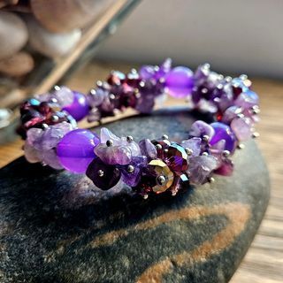 Pulsera elástica hecha a mano con piedras de amatista y cuentas cristales moradas. - Diseño único. - Piedras de amatista en bruto. - Cuentas de cristal facetadas.