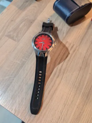 Reloj de pulsera con un llamativo diseño. - Correa de material sintético. - Esfera de color rojo vibrante. - Bisel plateado.