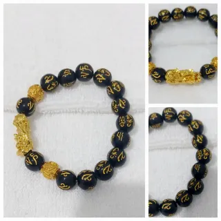 Preciosa pulsera, brazalete elástico con cuentas negras de obsidiana con grabado de símbolos chinos en dorado Pulsera unisex Feng Shui Pixiu #fengshuibracelet #pulserachina #pulserafengshui #braccialettofengshui #pulseirafengshui #pixui Pulsera de estilo Feng Shui con cuentas negras y detalles dorados. - Diseño con símbolos. - Elementos decorativos dorados.
