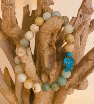 Pulsera elástica de cuentas de piedra turmalina en diferentes colores 🌈. Pulsera con cuenta en forma de tortuga 🐢 en color azul. Solo se realizan envíos 📦.