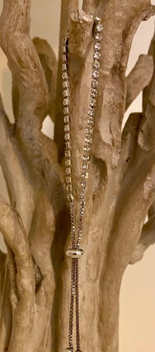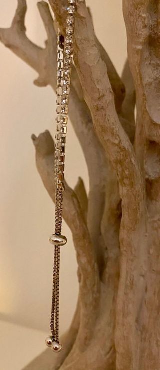 Pulsera ajustable de acero en color plateado. Pulsera con detalle de piedras transparentes y cierre ajustable de cordón. A la pulsera le falta una de las piedras, como se aprecia en las fotografías ✨. Solo se realizan envíos 📦.