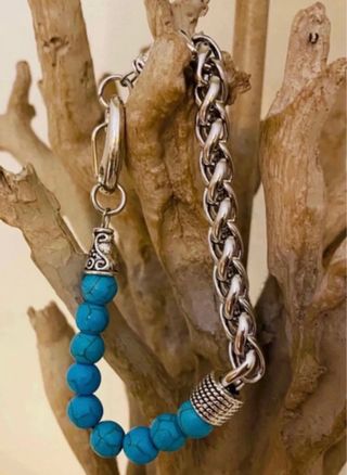 Pulsera de acero con eslabones en color plateado y cuentas de piedra turquesa. Pulsera con cierre de hebilla ✨. Solo se realizan envíos 📦.