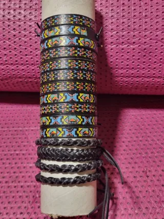 Conjunto de pulseras de cuero con llamativos diseños. - Pulseras con motivos geométricos y tribales. - Acabado en cuero. - Variedad de colores vibrantes.