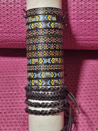 Lote de 40 pulseras elaboradas con tiras de cuero trenzado. Cada pulsera presenta un diseño único con diferentes combinaciones de colores. - Material: Cuero. - Diseño: Trenzado. - Cantidad: 40 unidades.