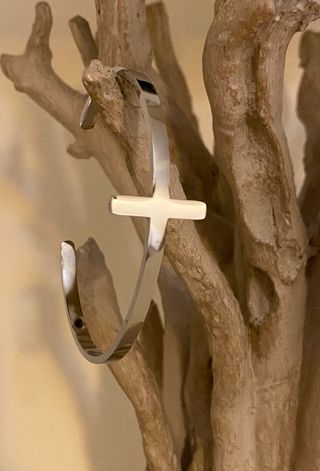 Pulsera rígida de acero ajustable en color plateado. Pulsera con detalle en forma de cruz ✝️. Solo se realizan envíos 📦.