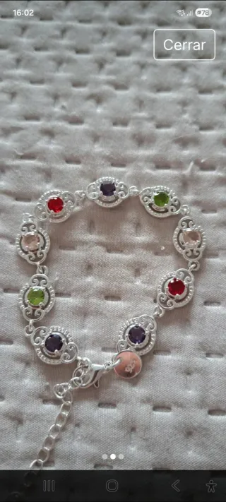 Elegante pulsera elaborada en plata con incrustaciones de piedras de diversos colores. Un accesorio llamativo y versátil. - Diseño con múltiples gemas de colores. - Cierre de mosquetón para mayor seguridad. - Detalle 925 grabado en la pieza del cierre, indicando la calidad de la plata.