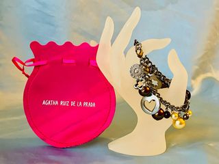Esta pulsera es una pieza de bisutería de la marca Agatha Ruiz de la Prada, caracterizada por sus dijes en forma de corazón y perlas en tonos marrones - Diseño con varios charms. - Combina perlas y detalles metálicos. No es nuevo, poco uso