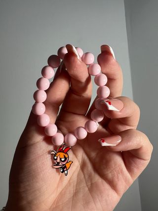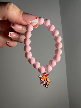Pulsera elástica con perlas grandes rosas y un divertido charm de Bombón. - Diseño de personaje de dibujos animados. - Pulsera con perlas grandes de color rosa.