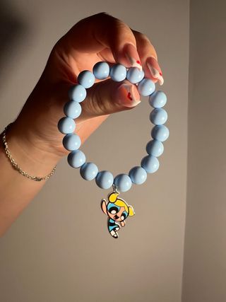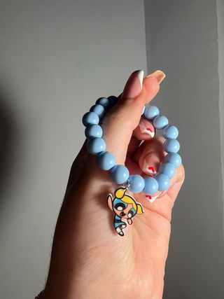 Pulsera con perlas grandes de color azul y un charm de Burbuja de Las Súper Nenas. - Perlas grandes redondas y lisas. - Charm de personaje de dibujos animados.