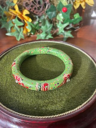 Pulsera pintado a mano y detalles decorativos. - Material: Madera. - Acabado: Pintado a mano con salpicaduras multicolor. - Adornos: Detalles en rojo, verde y con incrustaciones.