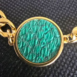 Elegante pulsera de bisutería con eslabones dorados y un detalle central circular en tono verde realizado con materiales naturales teñidos. - Diseño de cadena gruesa. - Círculo central con textura. - Cierre de mosquetón.