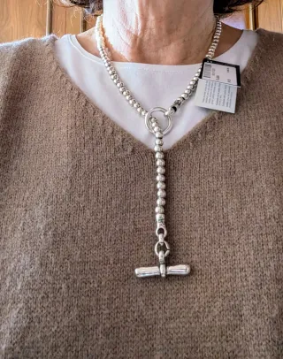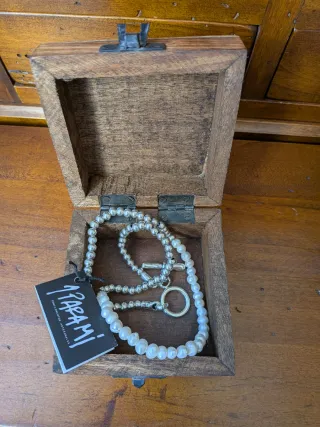 Puede usarse como collar o como pulsera. Combina cuentas plateadas con perlas de agua dulce Sin estrenar, con su caja - Cierre de tipo T-bar. - Diseño elegante y moderno.