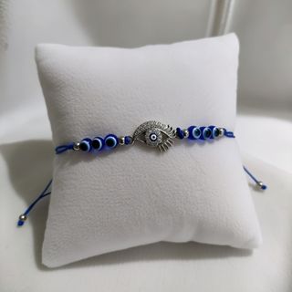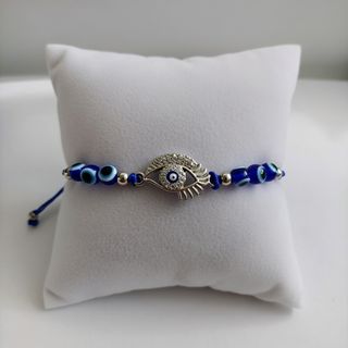 Pulsera con diseño de ojo protector y cuentas azules. - Cordón ajustable para un ajuste cómodo. - Detalle de ojo central con pedrería. - Cuentas de cristal azul.