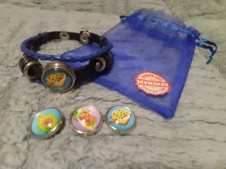 Nueva, DIY, de color azul eléctrico, con 4 distintos pines, broches o cabujones de cristal intercambiables con imágenes de motivos de comida rápida divertidos. Se entrega con bolsa de regalo de organza según las imágenes. En otro anuncio hay una fucsia a conjunto ;-)