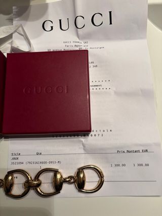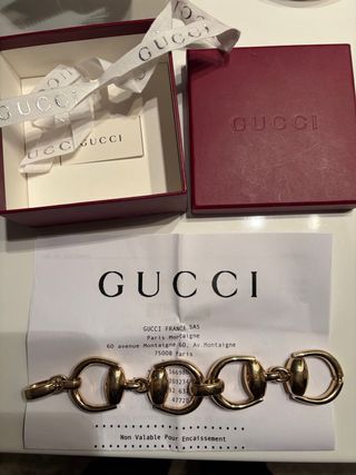 Elegante pulsera de la marca Gucci con un diseño de eslabones horsebit. - Color dorado. - Cierre de mosquetón. Incluye caja, funda guardapolvo, certificado y factura. PRECIO NO NEGOCIABLE.