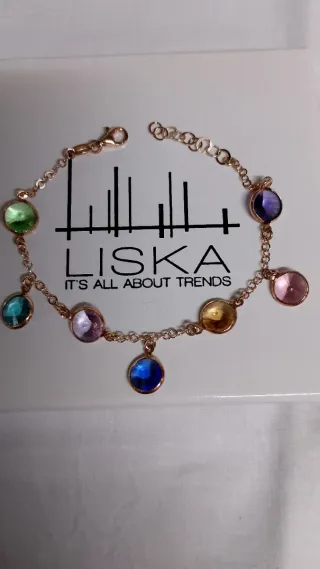 Elegante pulsera de la marca LISKA con un diseño de cadena delicada y adornada con varias piedras de diferentes colores. - Piedras de cristal en tonos verdes, azules, morados, rosas y dorados. - Cierre de mosquetón. - Cadena ajustable.