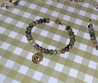 Elegante pulsera elaborada con cristales checos y un charm de sol. - Cristales facetados con tonos verdes y multicolores rústicos. - Cierre dorado. - Detalle de medalla con diseño de sol.