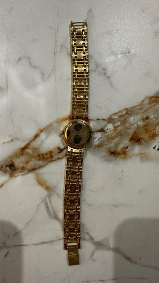 Elegante reloj de pulsera con un diseño clásico y sofisticado. - Pulsera de eslabones dorados. - Esfera redonda de color negro.