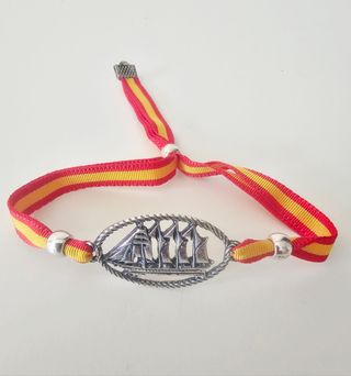 Pulsera con cinta de los colores de España y detalle de un barco velero. - Diseño ovalado con barco de tres mástiles. - Cinta con franjas rojas y amarillas.