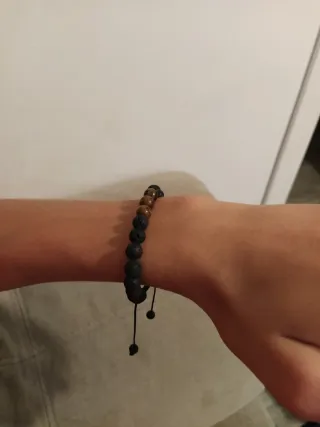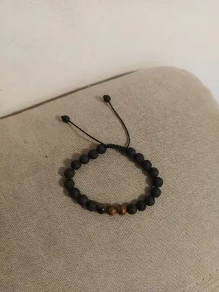Pulsera artesanal con cuentas de piedra volcánica y detalles en ojo de tigre. Su diseño ajustable la hace cómoda para cualquier muñeca. - Cuentas de piedra volcánica. - Abalorios de ojo de tigre. - Cierre ajustable.