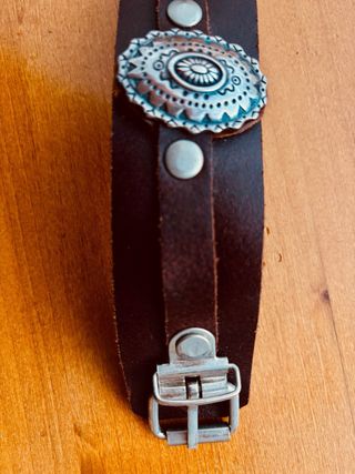 Pulsera de cuero con un diseño llamativo de alpaca. - Material: Cuero. - Adorno central plateado con detalles. - Cierre con remaches.