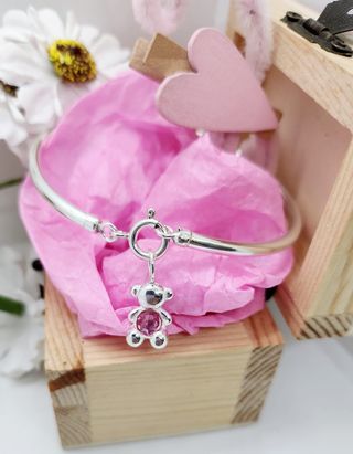 Preciosa pulsera de plata de ley 925. Es una pieza elegante y delicada. - Incluye dos encantos: un oso de peluche y una piedra rosa. - Diseño de cadena con eslabones ovalados y retorcidos. - Cierre de mosquetón.