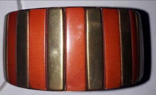 Preciosa pulsera brazalete de estilo vintage. Es una pieza única y llamativa. - Diseño con barras doradas y rojas. - Ideal para añadir un toque retro a tu look. - Años 80. - Mide 75 milímetros de ancho.